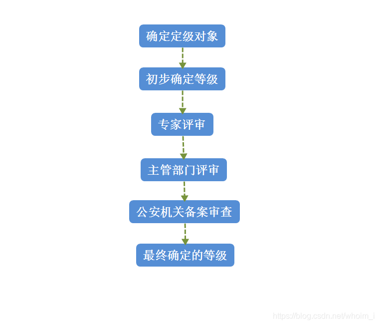 定級工作的主要內容包括:確定定級對象、初步確定等級、組織專(zhuān)家評審、主管部門(mén)審核、公安機關(guān)備案審查、最終確定等級。其流程圖如下: